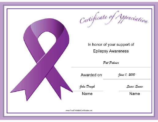 This epilepsy awareness certificate with a purple ribbon recognizes individuals and businesses that have donated toward or otherwise supported research into epilepsy and related seizure disorders.