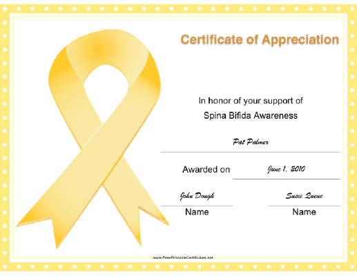 This spina bifida awareness certificate with a yellow ribbon recognizes individuals and businesses that have donated toward or otherwise supported research into spina bifida or its prevention.