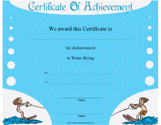 This Water Skiing Achievement certificate features two water skiers flying across the waves behind a powerful motor boat. Can certify achieving new skill level, or presented as an award in a competition.